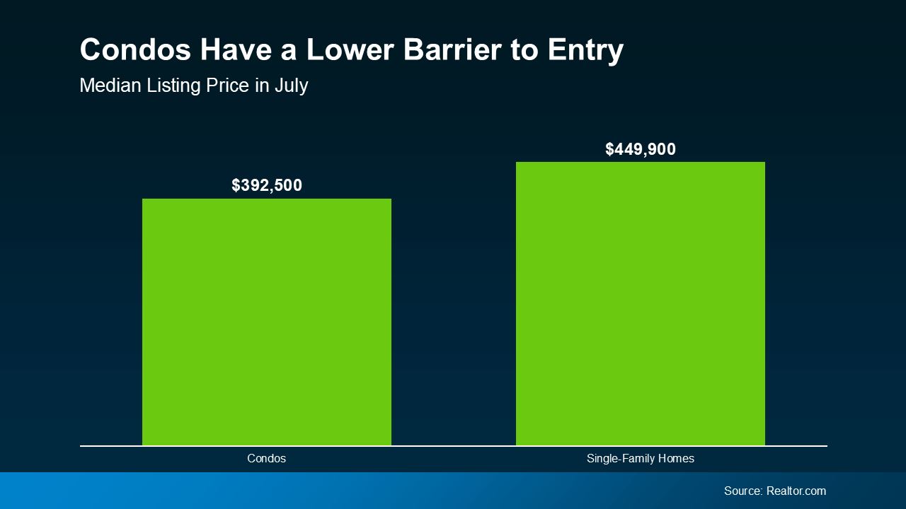 Since they're usually smaller than single-family homes, they can be easier on your wallet. While it’s not always the case, smaller square footage usually comes with a smaller price tag too. As a result, according to the latest data from Realtor.com, condos typically have a lower asking price than single-family homes (see graph below):